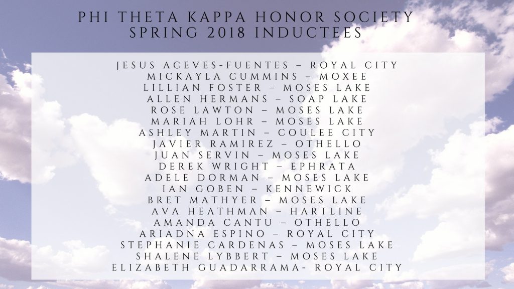 The new students inducted were: Jesus Aceves-Fuentes, Royal City; Mickayla Cummins, Moxee; Lillian Foster, Moses Lake; Allen Hermans, Soap Lake; Rose Lawton, Moses Lake; Mariah Lohr, Moses Lake; Ashley Martin, Coulee City; Javier Ramirez, Othello; Juan Servin, Moses Lake; Derek Wright, Ephrata; Adele Dorman, Moses Lake; Ian Goben, Kennewick; Bret Mathyer, Moses Lake; Ava Heathman, Hartline; Amanda Cantu, Othello; Ariadna Espino, Royal City; Stephanie Cardenas, Moses Lake; Shalene Lybbert, Moses Lake and Elizabeth Guadarrama, Royal City.